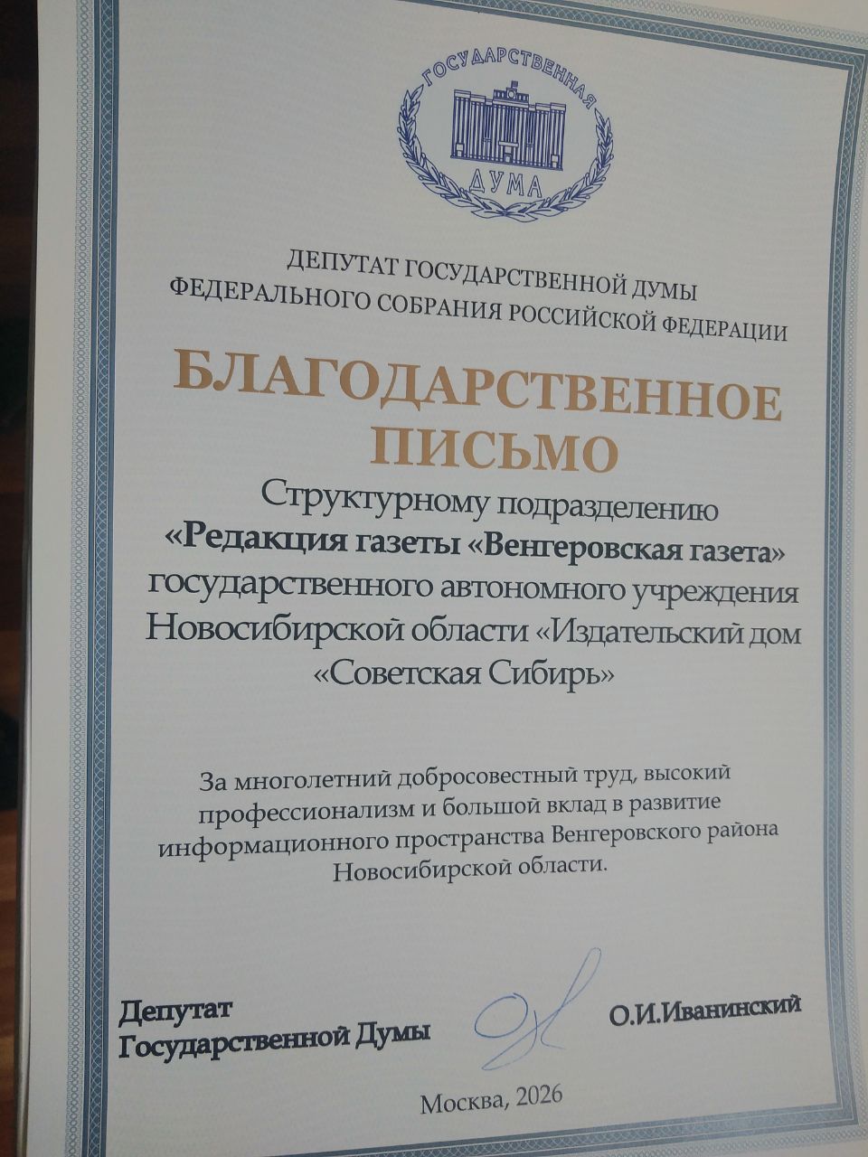Благодарственное письмо от депутата Государственной Думы О. И. Иванинского вручили на собрании трудовых коллективов главному редактору структурного подразделения «Редакция газеты «Венгеровская газета» государственного автономного учреждения Новосибирской области «Издательский дом «Советская Сибирь» Татьяне Линовской.