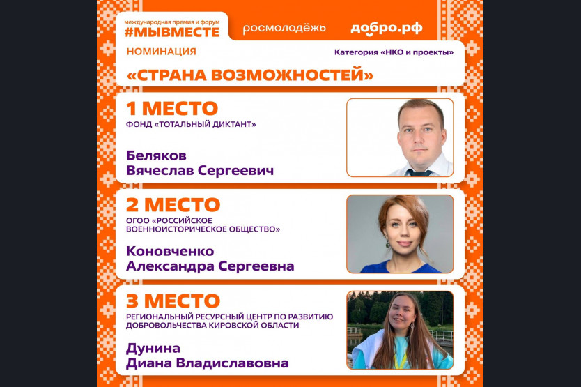Фонд «Тотальный диктант» стал победителем в номинации «Страна возможностей», которая объединяет проекты, сохраняющие историческую память, развивающие культуру, искусство, образование, инициативы в области науки, IT, наставничества, патриотического воспитания и медиа. Торжественная церемония награждения состоялась в рамках Международного форума гражданского участия #МЫВМЕСТЕ, который проходит в Москве со 2 по 5 декабря с участием Президента Российской Федерации.