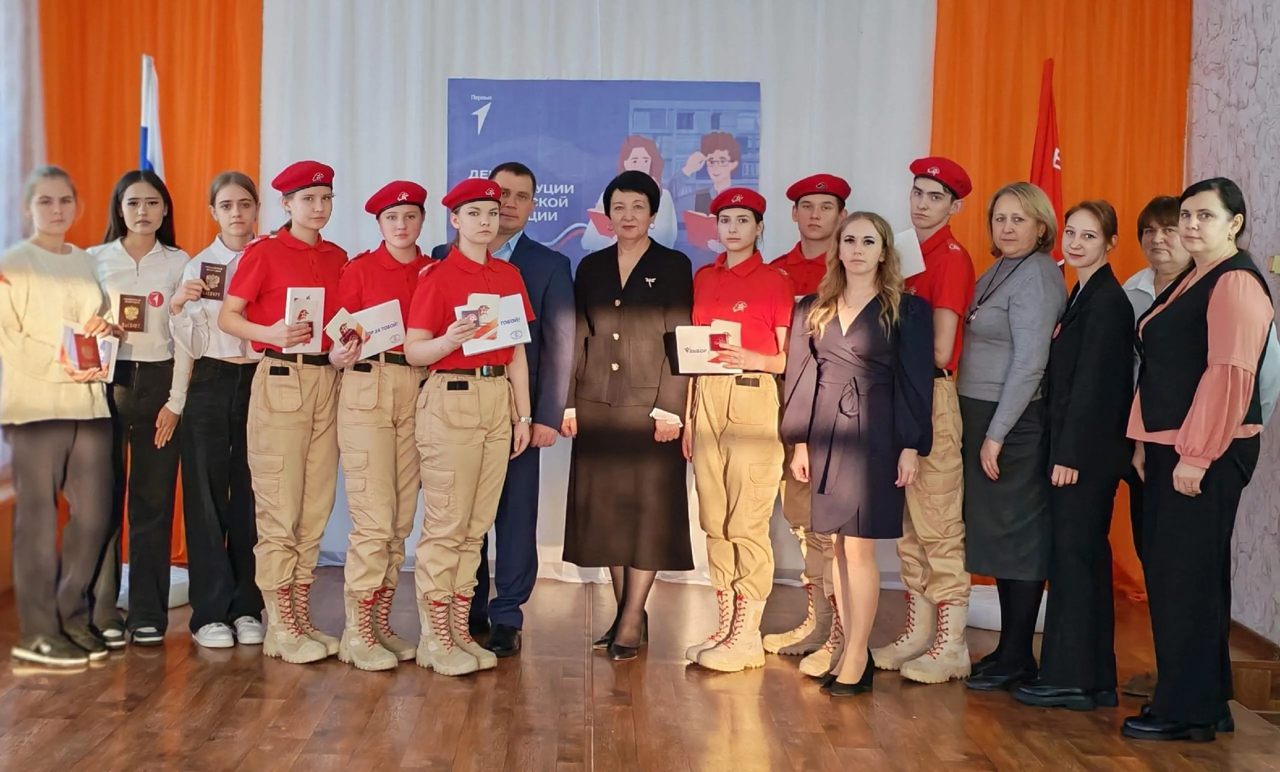 Шесть школьников вступили в ряды «Юнармии». Ребята зачитали торжественное обещание Движения Первых и клятву «Юнармии». Юные патриоты получили обложки на паспорт, значки и личные книжки достижений «Юнармия».